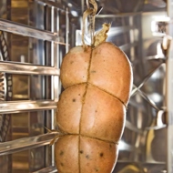 Tightly tie the ends of the sausage on both sides with sturdy twine. Bake in the oven at 176°F for about 6 hours. On average, a 500-gram cooked sausage takes about 3 hours to bake. Accordingly, the heavier the sausage, the longer the cooking process.