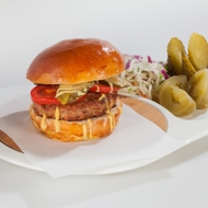 Moscow cutlet served with a bun, mustard, and a pickle.