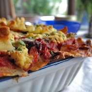 In a small square dish, layer some cheese, followed by a layer of filling. Repeat the layers as needed. Finish with a layer of grated cheese and sliced tomatoes on top.