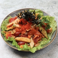 Place the chopped fruits, vegetables, and fish into a bowl and add all the spices from the dish. Mix well and serve on a plate with salad leaves.