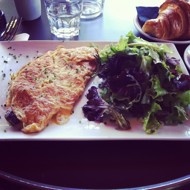 Hold a plate in your left hand, remove the skillet from the heat with your right hand, tilt it over the plate at a slight angle to let the omelette slide out — and carefully place it.