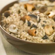 In a heavy-bottomed skillet, heat the oil, add the finely chopped onion and garlic, along with the mushrooms, and stir. Once the onion begins to brown, add the rice, mix well, and reduce the heat.