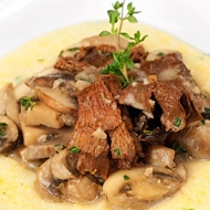 To serve, spoon the polenta onto plates and top with the mushroom sauce. Garnish with herbs.