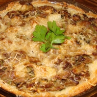 For the filling, sauté the onion and mushrooms. When the liquid evaporates, add salt, pepper, herbs, 1 tablespoon of flour, and pour in the cream, heating for 3–5 minutes, stirring until slightly thickened.
