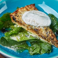 On a plate, place spinach leaves, then add a piece of pie and top it with a spoonful of the sour cream and truffle cream. Drizzle with green oil and sprinkle with ground pepper.