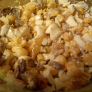 Chop the eggs, add the corn, and the mushrooms with onion.