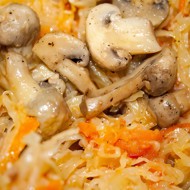 Layer half of the stewed cabbage in a skillet, place the prepared mushrooms on top, and cover with the remaining cabbage. Sprinkle the cabbage with breadcrumbs and drizzle with oil, then place the skillet in the oven to bake.