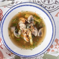 The main secret of this simple soup is to make it in season and use good wild mushrooms. You can add birch boletes or aspen boletes to the broth — they will provide richness, but be sure to include at least one porcini mushroom, solely for its aroma. Otherwise, it's straightforward home cooking and should remain that simple: sautéed carrots with onions, buckwheat, and dill. And no garlic, and heaven forbid, no mustard or horseradish — the natural delicate mushroom essence stands well on its own, best left unadulterated. Recipe by John Smith, chef at American Bistro.