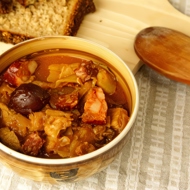 Add the finely chopped ham (2 cups), sauerkraut, broth, barley, bay leaves, salt, and pepper. Bring to a boil, reduce the heat, cover, and simmer until the barley is cooked, about 30-45 minutes.