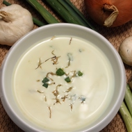 Pour the pureed soup into a clean pot, heat it up, and stir in the butter. Taste and add salt and pepper if needed. Serve in warmed bowls, topped with the creamy sauce.