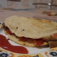 Mix flour, butter, salt, and water to make the dough. Roll it out thinly (this amount of dough makes about 5 flatbreads).
