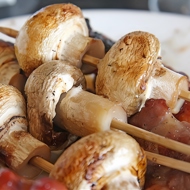 Thread the mushroom caps onto skewers alternately with pieces of bacon. Brush the resulting kebabs with the rosemary oil and grill, turning and basting with oil for about 15 minutes, until the mushrooms are soft and cooked through. Serve immediately.