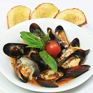 Garnish the finished mussels with cherry tomatoes, basil leaves, and serve with garlic croutons.
