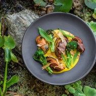 Garnish with fresh lemon verbena and sprinkle with dried toothfish flakes.