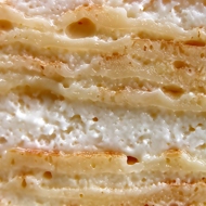 Cut the cooled pastry into 4 parts. Spread the cheese mixture on the layers and top with slices of pear. Leave the top layer unspread.