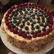 Layer the cooled cake layers alternately, spreading cream between each layer. Once the last layer is placed, press down on the assembled cake. Cover the top with cream and sprinkle with crumbs made from one of the cake layers.