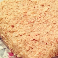 Now take the cake layers, generously spread cream on each one, and carefully stack them on top of each other. Set one layer aside for the cake crumbs.
