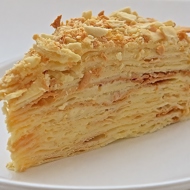 Roll each piece of prepared dough into a thin layer. Bake in the oven at 518°F until a golden crust forms. Spread the layers with cream and stack one on top of the other. You can bake the leftover layers, crumble them, and use the crumbs to decorate the cake.