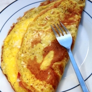 Pour the mixture onto a hot frying pan with oil and fry over high heat, gently shaking the pan to ensure the egg mixture heats evenly. As soon as the omelet begins to thicken, use a flexible spatula to fold the edges towards the center from both sides, thereby shaping the omelet into an elongated pie. Carefully slide it seam-side down onto a plate or oval dish, brush with a piece of butter, and serve immediately.