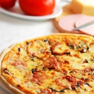 Grease the surface of the flatbread with pork fat, sprinkle with grated cheese, arrange cubes of cheese, slices of sausage (or hot dogs), tomato slices, olives, and herbs—season with salt and pepper to taste.