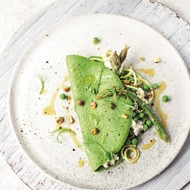 To serve, place the pancake on a plate, top it with zucchini or courgettes, asparagus, peas, and pieces of ricotta. Season well, drizzle with lemon juice, and sprinkle with pistachios. Fold the pancake in half, lightly drizzle with olive oil, and garnish with pea shoots.