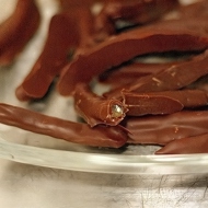 Using a fork, dip the peel in the chocolate and place it on a rack or parchment paper. Allow to set.