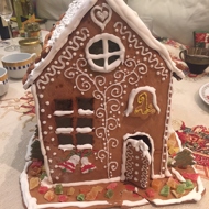 Decorate the house with royal icing (for this, whip 3–4 egg whites with 2 cups of powdered sugar). Decorate as desired (with candies, gummies, or decorative toppings). For more detailed pattern drawing, you can use a pastry bag.