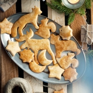 Lightly dust the work surface with flour and roll out the dough to a thickness of 5 mm. Cut out shapes using a knife or cookie cutters. If you plan to hang the cookies on the tree, make a hole at the top using a straw.