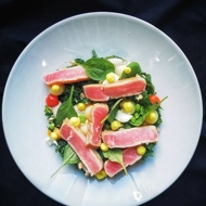 Then add a few drops of saffron aioli to the salad, placing 3 small quenelles of vitello sauce on top. Finally, lay strips of tuna with the red side facing up.
