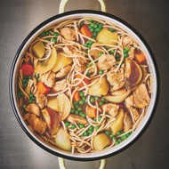 Sauté for another 2 minutes, then pour in the soy sauce, mirin, sake, and add the powdered sugar. Mix well. Transfer the shirataki noodles as a block onto a cutting board, cut into four parts, and add to the pot. Then pour in the dashi broth.