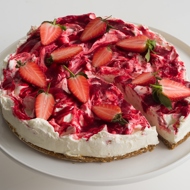Place the cheesecake in the freezer for 6 hours. Remove the cheesecake from the freezer 1 to 1.5 hours before serving. Once it has softened slightly, remove the sides of the springform pan. Garnish the cheesecake with fresh strawberries and serve.