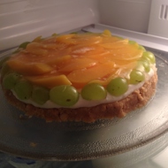 Slice the peaches into wedges and arrange them on the cheesecake, which should have set by now. Carefully pour the cooled gelatin syrup over the cheesecake and refrigerate for another 2 to 3 hours.