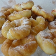 Cut into strips, twist into spirals, and connect them into rings. You can also make different shapes. Heat vegetable oil in a pan and fry the donuts on both sides.