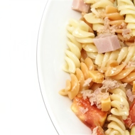 Boil the noodles. Cut the ham, tomatoes, and onions into cubes.