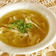 Pour the broth into a pot and bring to a boil. Stirring, add the noodles and cook for 15 minutes — or as indicated on the package: your goal is to slightly undercook them.