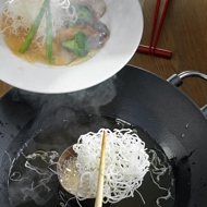 Place a high culinary ring with a diameter of 7-8 cm in the center of the wok. Divide the rice noodles into two parts, and dip each part into the ring with oil for half a minute — this will create fluffy balls resembling either bird nests or tumbleweeds. Transfer them to a paper towel.