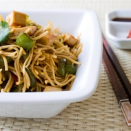 Soak the rice noodles in hot water. Once they become soft, drain them in a colander.