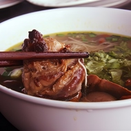 Cut the ham into strips and add to the soup. Sprinkle with chopped herbs and peas.