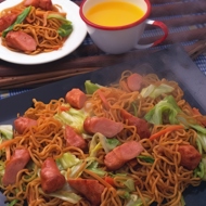 Cut the sausages into four pieces, mix with the noodles, and add soy sauce.