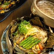 Place two lotus leaves, stacked together, flat on a large plate. Remove the asparagus from the wok and place half of the contents from the pan onto the leaves, topping it with five asparagus halves. Fold the edges of the leaves to create an envelope. Repeat with the second pair of leaves.