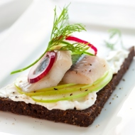 Take out the herring. It is preferable to use canned herring, which can come in various flavors. I recommend the wine-flavored one with herbs, usually pre-sliced. Place the herring on top of the cucumber on the sandwiches.