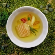 Add the slices of salmon and vegetables to the boiling strained broth, and simmer gently until cooked through.