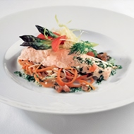 Prepare the broth: boil the peeled vegetables, lemon, dill, and parsley in water with white wine and spices. Steam the Norwegian salmon fillet for 15 minutes over the boiling broth. Cut the vegetables into strips and sauté with fresh garlic and chili pepper. Then arrange the vegetables and steamed salmon on a plate. Garnish with green shoots and dress with tomato-dill sauce.