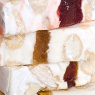 Add the vanilla and butter and beat for another 5 minutes, then fold in the almonds and cherries using a wooden spoon. Spread the mixture onto a baking sheet and smooth it out. Cool for 2 hours until set. Turn out onto a board and cut into small squares. Wrap each piece in cellophane and store in the refrigerator.