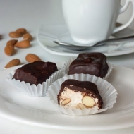 Melt the chocolate in a water bath or in the microwave. Dip the pieces of nougat in chocolate and place them on a tray lined with parchment paper.