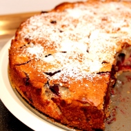 Add the chopped plums, flour, ground almonds, and baking powder, and gently mix everything together. When adding the flour, do not rush, as it is better to under-add than to over-add in this case. The dough should not be too thick.