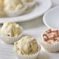 Meanwhile, melt the white chocolate in a water bath or microwave. Remove the balls from the freezer and dip them in the chocolate. Place them on parchment paper and let them set.