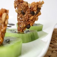 Bring the honey to a boil, add the nuts, flakes, and raisins, and mix well.