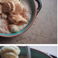 Add the mashed banana to the boiling milk, then add salt, sugar, spices, and oatmeal.