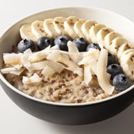 Transfer the oatmeal to a deep bowl and top with banana, blueberries, and coconut chips.